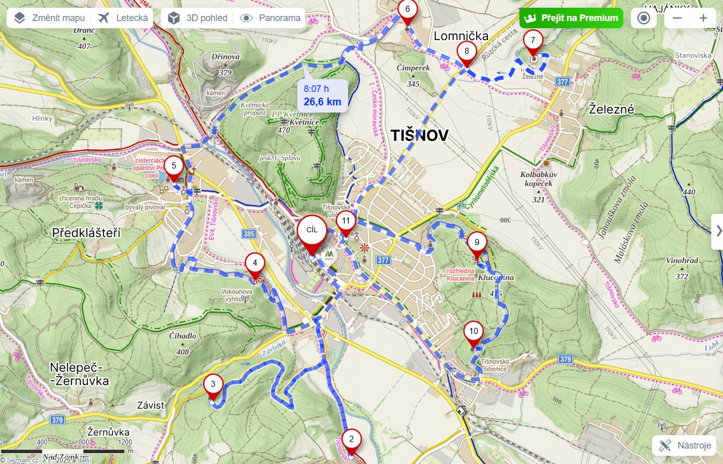 Trasa tišnovského pochodu no. 1 - 26 km (virtuální trasa vojenského pochodu) - Tišnov (nádraží) - Březina - Výrovka - Vokounova vyhlídka - Předklášteří (Porta Coeli) - kolem Dřínové podél Besénku do Lomničky - z Lomničky na Rejholec - směr Jamné - odbočka u vodárenského objektu - stezka Ráčka Železníčka - hradiště v Železném - dolů z hradiště na Růzckou stezku - Tišnov (ke hřbitovu) - naučnou stezkou Klucanina na rozhlednu - z rozhledny Klucanina na tišnovskou šibenici - zpět do Tišnova Cestou hrdelního práva - Tišnov (nádraží).