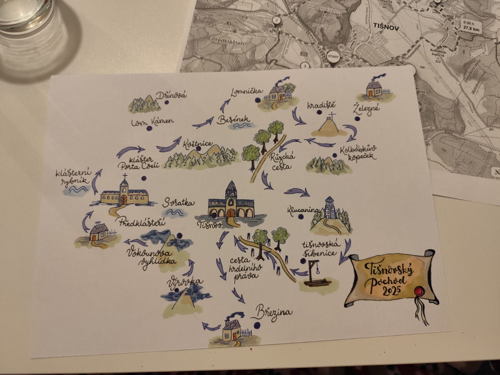 Komunikace s organizátory byla bezproblémová. Poslala jsem registrační formulář (tabulku excel), kterou jsem si stáhla z oficiálního webu. Dostala jsem odpověď do 24 hodin. Uhradila jsem startovné a hned si plánovala trasu pochodu. První jsem šla vojenský pochod pro připomenutí Dne vítězství. Dokonce to dopadlo tak, že se ke mě přidal kamarád Rony. Slíbil, že si se mnou pochod zajde, tak ať naplánuji trasu Tišnovskem a vyrazíme. Pojala jsem to trochu pečlivě. Dlouho jsme se s Ronym neviděli, jsme kamarádi už roky a teď po nějaké době u příležitosti takového speciálního pochodu se zase potkáme. To chce mapu! A tak jsem využila svou trošku kreslířského talentu a namalovala dárkovou originální mapu naší trasy. Zároveň jsem chtěla, aby měl Rony něco na památku, protože on si registraci na pochod neudělal.